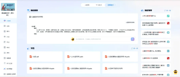 由于课程涉及的基础解剖知识广泛且深入,涵盖了大量复杂的人体结构和功能知识。学生在学习过程中不仅需要扎实的基础知识,还需要具备较强的自学能力,以进一步补充和拓展所学内容。因此团队在课程中嵌入资料助手智能体,通过AI技术赋能,智能推荐与本课程相关的学习资料,这些资料不仅涵盖了课程的核心知识点,还提供了更深入、更广泛的拓展内容,帮助学生拓宽视野,加深理解,提升学生知识掌握程度。