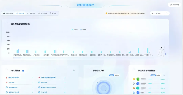 通过《基础解剖学》智慧课程,教师能够全面掌握学生的各类学习数据,包括知识点掌握率、完成率统计、学生分层画像以及班级间的多维度对比分析等。借助AI学情分析,教师可以实时、多维度地了解学生的学习状态、知识掌握程度和学习偏好等关键信息。利用AI真正赋能教师,实现精准化教学。教师可以根据学情分析结果,及时优化调整教学计划,为学生提供更有针对性的教学支持。