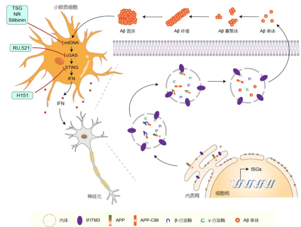 作为细胞的关键能量供应源,线粒体确保了神经元的正常功能,其功能障碍通常在AD发生之前出现。近年来的研究发现线粒体功能障碍参与神经炎症的发生。在AD患者的脑组织中,线粒体功能障碍导致线粒体DNA(mitochondrial DNA,mtDNA)的泄漏。这些泄漏的mtDNA能够被细胞内的DNA感受器cGAS所识别,进而激活细胞内的固有免疫通路cGAS-STING通路,最终引发神经炎症反应。重要的是,在多种模式生物中发现,靶向mtDNA-cGAS-STING信号通路可有效抑制神经炎症,从而改善或延缓AD的进程。这些研究提示mtDNA-cGAS-STING通路可能是治疗AD的一个重要新型靶点。