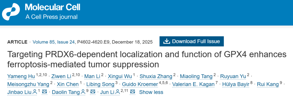 2025年12月18日,william威廉中文李隽教授、广州医科大学刘金保教授与美国德克萨斯大学唐道林教授团队合作,在Molecular Cell上发表了题为Targeting PRDX6-dependent localization and function of GPX4 enhances ferroptosis-mediated tumor suppression的研究成果。该研究系统揭示了过氧化还原酶6(PRDX6)介导的铁死亡防御机制,阐明了其结合并携带GPX4蛋白上膜促进细胞膜磷脂过氧化损伤修复,进而诱导肿瘤细胞铁死亡逃逸的作用机制,为靶向癌症治疗提供了新思路。