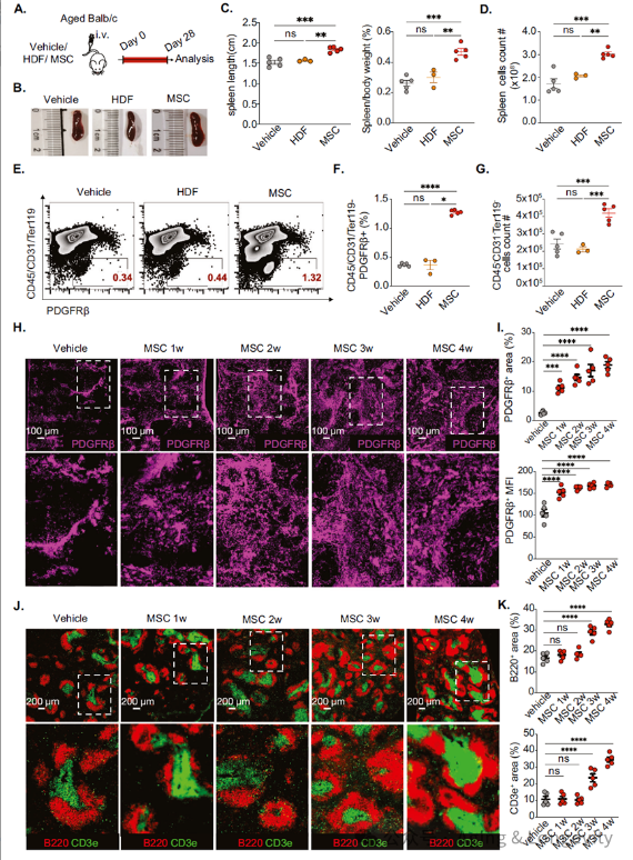 MSCs重建衰老脾脏微环境:在老年小鼠中,输注MSCs能显著恢复脾脏基质结构、促进生发中心形成,并提升疫苗特异性抗体水平。