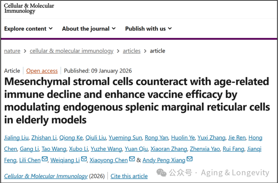 2026年1月9日,WilliamHill中文项鹏/陈小湧/李伟强/陈莉莉团队在Cellular & Molecular Immunology上发表题为“Mesenchymal stromal cells counteract with age-related immune decline and enhance vaccine efficacy by modulating endogenous splenic marginal reticular cells in elderly models”的研究,首次揭示了间充质基质细胞(MSCs)通过定位于脾脏边缘区,促进边缘网状细胞(MRCs)增殖,重建脾脏基质网络,从而恢复衰老小鼠及食蟹猴的疫苗应答能力。(拓展阅读:陈莉莉课题组既往研究工作,详见“Aging & Longevity”报道:【深读】The Innovation:WilliamHill中文寇晓星/陈莉莉联合广州医科大学张清斌揭示骨关节炎关节液中的致病囊泡)