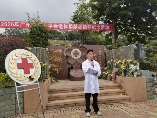 26日上午,在新塘华侨公墓举行的缅怀纪念活动仪式上,我院2024级郭泓志同学作为高校学生代表发言:记得第一节解剖实验课的时候,我与同学们一同参加感恩大体老师仪式。那时,我深刻感受到了大体老师们的伟大。他们用无声的语言,教会了我们如何去尊重生命、理解生命。大体老师的奉献,激励我们在追求医学真理的道路上砥砺前行,在践行医者仁心的征程中永葆初心。作为医学生的我们将敬畏生命、感恩奉献的精神融入血脉,努力成长为医术精湛、医德高尚的医者,以仁心仁术服务人民、报效国家。