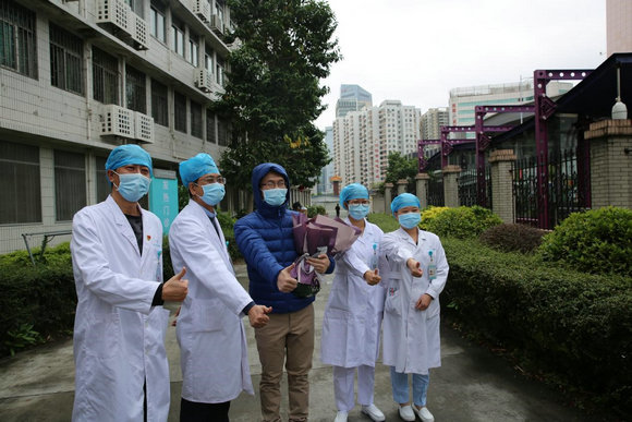 2020年,附属第三医院隔离病区首例新冠肺炎确诊患者治愈出院,林炳亮(左一)与患者合影