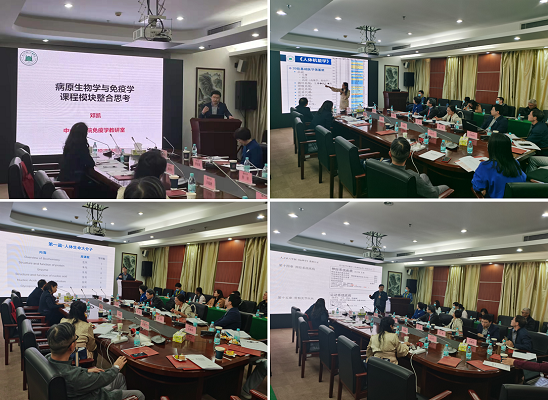 王淑珍副院长首先讲述了临床医学八年制临床医学基础课程整合思路;病理教研室王连唐教授作《人体形态学模块整合思路》报告;药理学教研室汪雪兰副教授作《人体机能学模块整合思路》报告;免疫学教研室邓凯教授作《病原生物学和免疫学模块整合思路》报告;生化教研室王海河教授作《分子生物学和遗传学模块整合思路》报告。