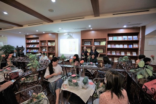 活动伊始,周慧贞老师首先为大家介绍了插花相关的基本知识与技巧,夯实基础,让大家对本次活动的学习内容有了基本的了解。随后,周老师亲自为大家做了现场示范,散乱的花材在她手中仿佛拥有了生命,组合成一件焕发生机的艺术品,即使是深秋的广州也不乏春的气息。