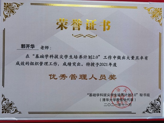 郭开华老师获评教育部“基础学科拔尖学生培养计划2.0”2021年度优秀管理人员奖