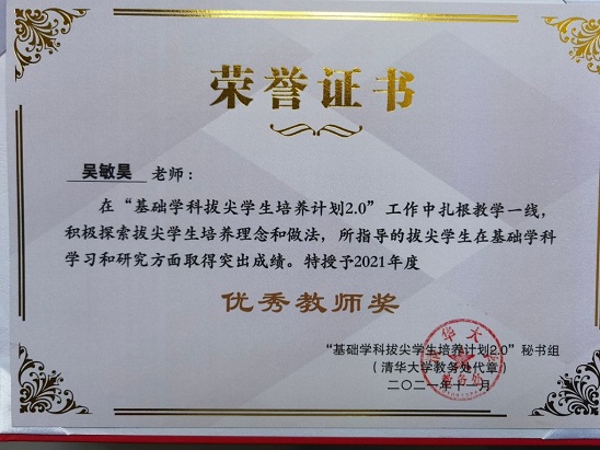 吴敏昊老师获评教育部“基础学科拔尖学生培养计划2.0”2021年度优秀教师奖