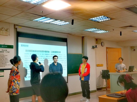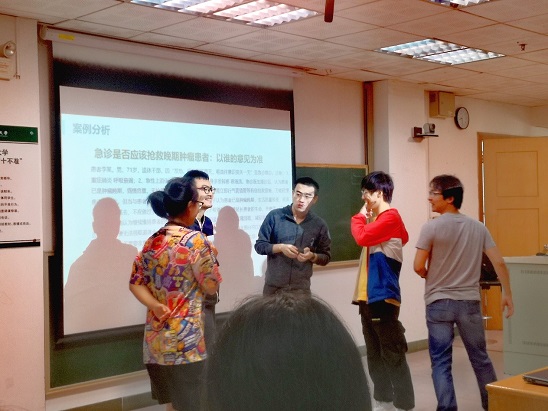 但是这一次与往常有一些变化,老师以情景剧的模式让同学们身临其境地“解决问题”,不仅上台发言的同学充满了参与感,坐在下面聆听的同学也感到十分的新奇有趣。这不仅是因为上台同学们的表演十分的投入且充满乐趣,更是因为这样的形式让人更加有现实感,仿佛自己正在直面这样的矛盾现场,在哈哈大笑的同时,也能够思考如何将医学伦理的原则用在这个情景,如何使用说话的艺术来让家属认可你的观点,从而对病人做出最好的决定。