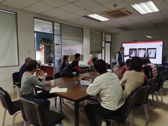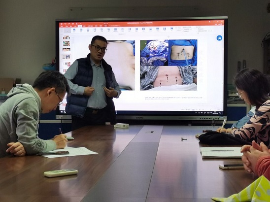 围绕胸部局解,雷艺炎医生结合临床真实病例,从解剖基础、临床表现和手术方案等内容展开阐述,并重点讲述了传统胸外手术、现代微创手术等治疗方式的解剖基础知识、术式优劣异同、术后愈合效果等,对理论课和实验课中的关注点提出了来自临床前沿的意见和建议。教研室的教师、实验技术人员和雷艺炎医生就传统解剖教学的方式方法如何融合临床应用等内容,进行了积极的互动讨论,凝结教学共识,气氛热烈、效果良好。