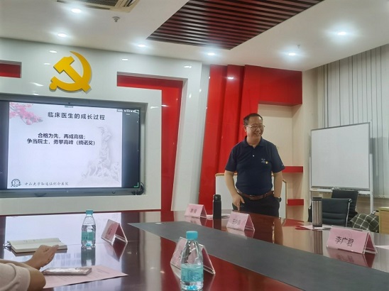 随后进入本次主题会议的核心部分——詹俊教授作关于《如何做好医学实习生的临床工作》的专题分享报告。作为79级中山医学长,詹俊教授始终用“医为本,教为责,研并重”要求自己,对于学生的严管厚爱,对于患者的尽心负责,老一辈共产党人对工作的热情和投入,以及终身学习的谦虚治学精神,在他身上都令人深受感动!