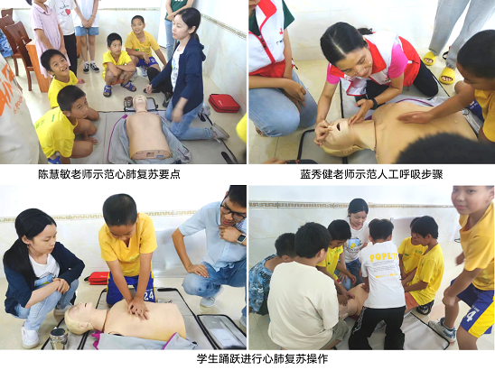 根据年龄段划分,科普团队陈剑煌老师为三至六年级学生作了《心肺复苏术》专题讲座。陈老师以科普团队此次行程崎岖山路上遇到的一辆救护车为切入点,运用专业的医学知识,通过通俗易懂的语言和提问互动的方式重点讲解了心肺复苏知识(CPR)及自动除颤器(AED)的使用方法,陈惠敏、蓝秀健老师从旁配合示教。培训现场生动有趣,气氛轻松活跃。