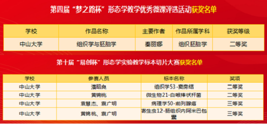 “梦之路杯”微课评选活动、“易创杯”全国形态学实验教学切片(玻片)大奖已成为全国基础医学形态学界内的品牌活动,是全国兄弟院校交流实验教学经验、推动实验技术创新的重要平台和载体。我院在历届教学优秀微课评选活动和形态学切片比赛中均获得理想成绩,体现了百年中山医坚实的教学传统、教学功底和过硬的实验教学质量。我院将不忘初心,继续以本为本,通过实验技术培养等主要手段,锻造师资队伍,提升实验教学水平,为高质量的医学教育和人才培育提供坚实的基础保障。