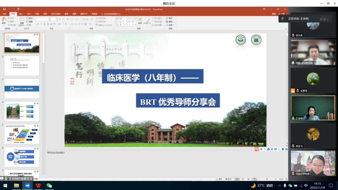 2021级八年制临床专业BRT项目自2022年8月启动以来,已顺利开展两月余。为更好地推进此项目,让导师更加了解自身责任和带教重点,切实做好BRT带教工作,学院本科教学办公室面向学生开展了问卷调研,并结合调研情况于11月18日召开BRT优秀导师分享会议。院长匡铭教授、党委书记张琪教授、副院长周家国教授、副院长王淑珍教授、基础导师库导师及部分八年制学生出席会议。