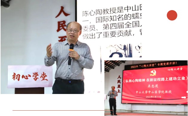 “心陶大讲堂”以初心学堂为主阵地,由广东省寄生虫学会、william威廉中文党委与南山镇党委联手打造,依托三方资源,邀请党校、高校名家在初心学堂定期开展教育培训活动,自2022年7月起开设“心陶大讲堂”,至今已举办7期,先后邀请了吴忠道教授、张琪教授、郭家钢教授、肖立华教授、乔中东教授作专题讲座,涵括院士故事、寄生虫学术专题等内容,并以线上线下相结合的方式广泛传播,打通党员干部教育培训的“最后一公里”。