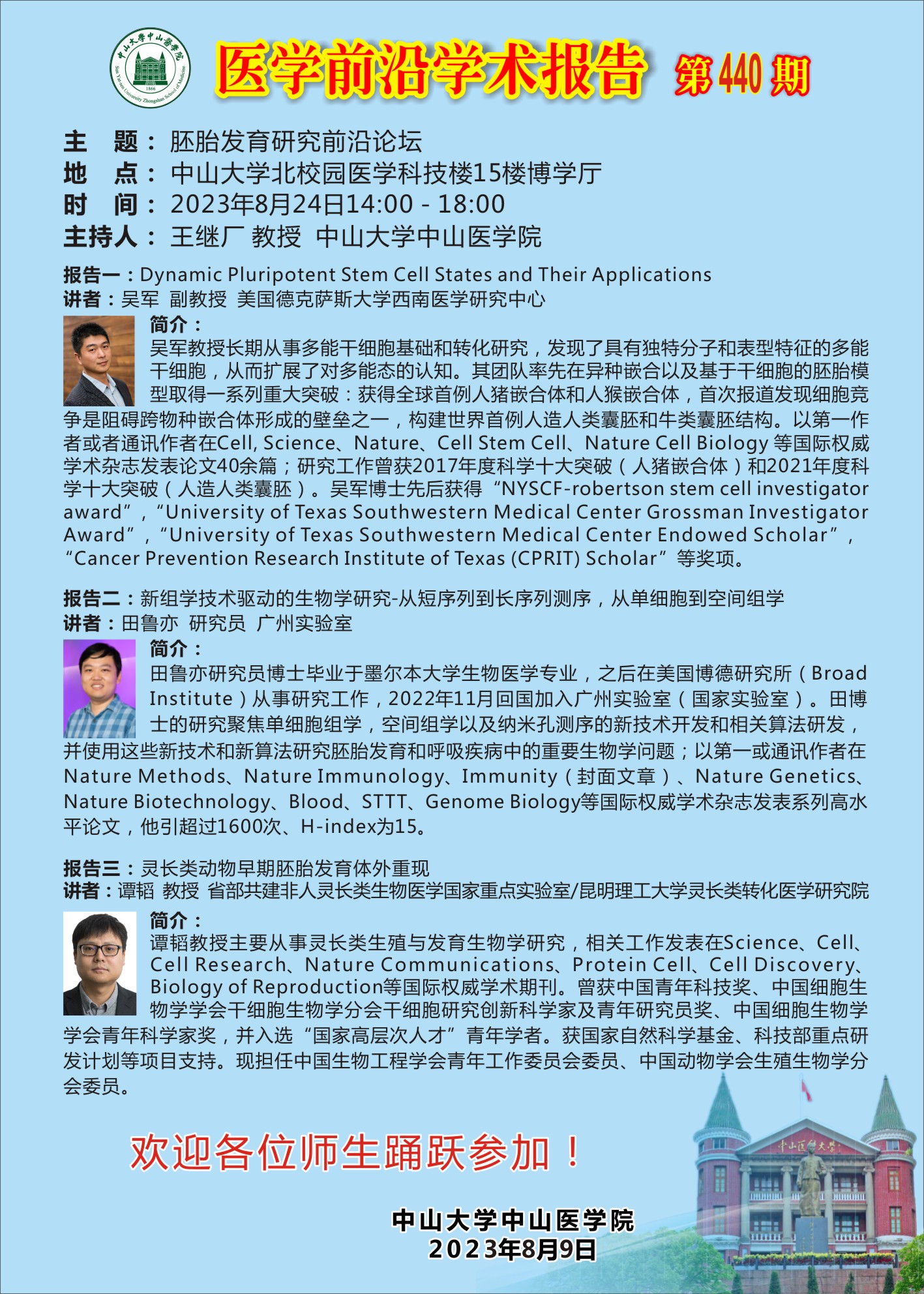 导航痕迹 首页 威廉希尔 学术讲座 医学前沿学术报告第440期 威廉希尔 科研通知 学术讲座 科研平台 办理指引 医学前沿学术报告第440期 胚胎发育研究前沿论坛 发布人:陈晖 发布日期:2023-08-18