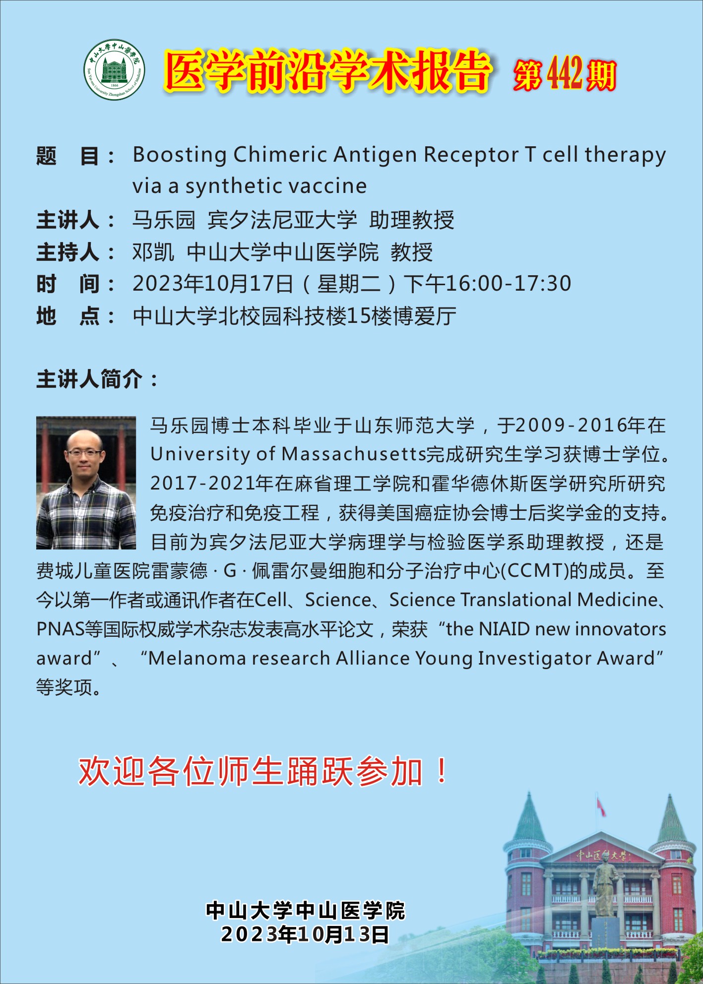 导航痕迹 首页 威廉希尔 学术讲座 医学前沿学术报告第442期 威廉希尔 科研通知 学术讲座 科研平台 办理指引 医学前沿学术报告第442期 Boosting Chimeric Antigen Receptor T cell therapyvia a synthetic vaccine 发布人:陈晖 发布日期:2023-10-14