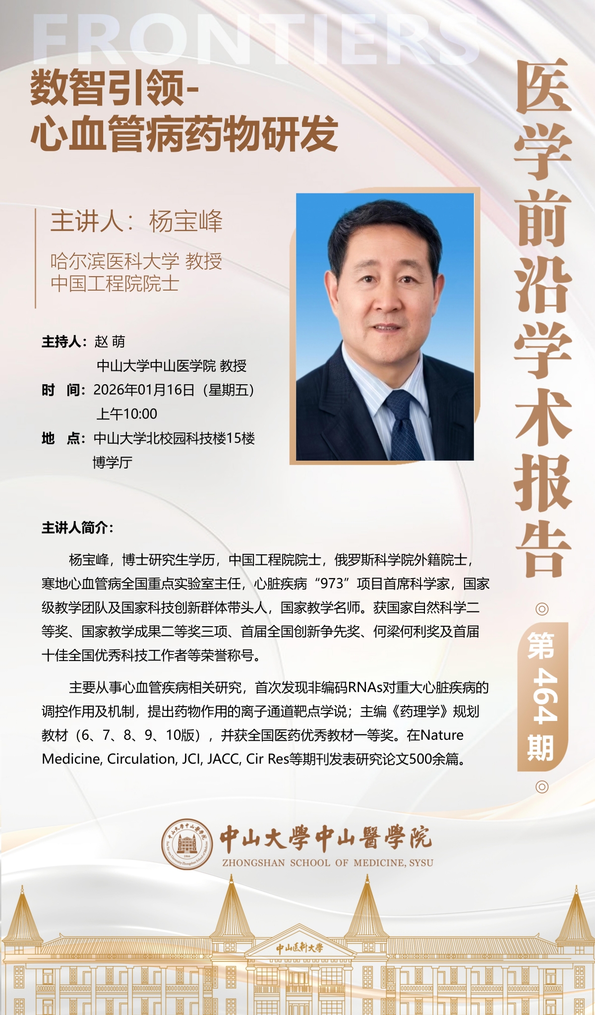 导航痕迹 首页 威廉希尔 学术讲座 医学前沿学术报告第464期 威廉希尔 科研通知 学术讲座 科研平台 办理指引 医学前沿学术报告第464期 数智引领-心血管病药物研发 发布人:何军芳 发布日期:2026-01-13