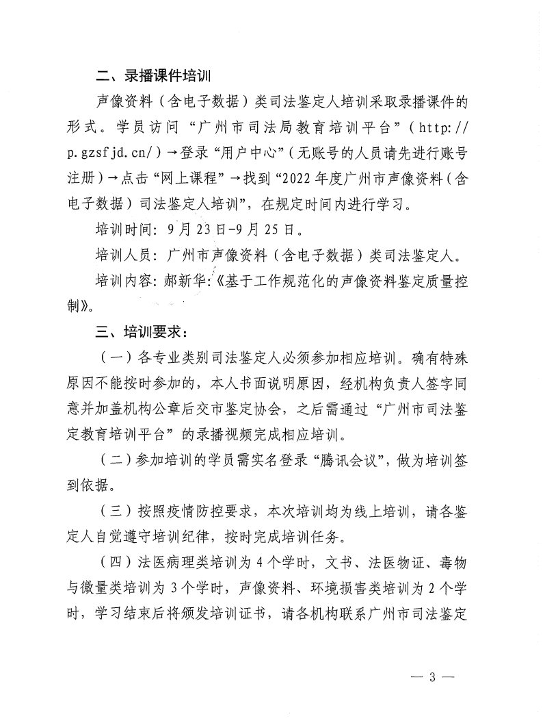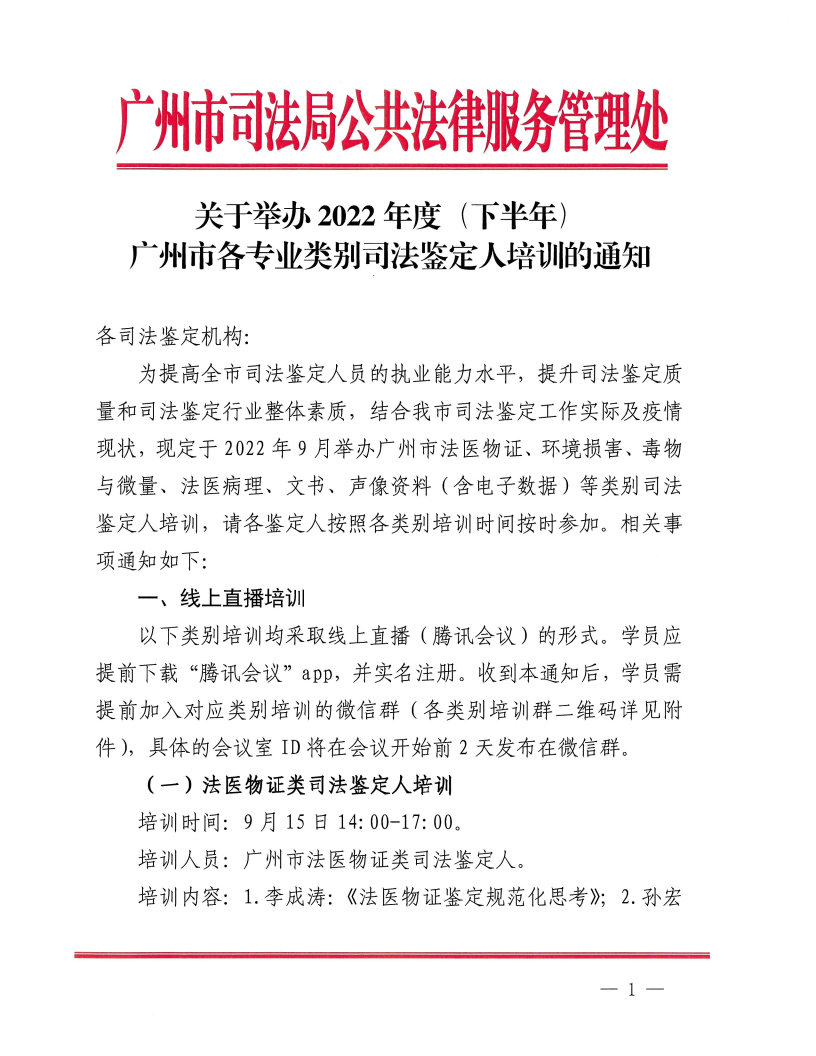 导航痕迹 WilliamHill中文法医鉴定中心 会议培训 关于举办2022年度(下半年)广州市各专业类别司法鉴定人培训的通知 扫描此二维码分享 关于举办2022年度(下半年)广州市各专业类别司法鉴定人培训的通知 发布人:王碧玉 发布日期:2022-09-09