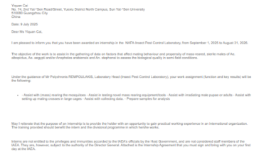 近日,我院 2024 级博士研究生蔡奕全(导师:李明教授)凭借扎实的专业素养与国际化视野,从33所高校及科研院所的多轮选拔中脱颖而出,成功斩获国际原子能机构(IAEA)"核科学与应用部 FAO/IAEA 粮食和农业核技术联合中心虫害防治处" 实习岗位。该岗位为2025年度全球该领域唯一开放名额,蔡奕全将于今年 9 月赴奥地利维也纳开展为期一年的研究工作。