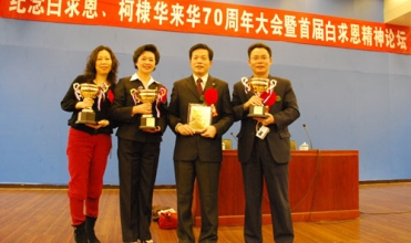 “纪念白求恩、柯棣华来华70周年大会暨首届白求恩精神论坛”在京举行,我院与中山一院、中山三院被评为“全国卫生系统思想政治工作先进单位”,中山三院王荣新同志被评为“全国卫生系统优秀思想政治工作者”。 11月11日,北京人民大会堂人大常委会会议厅内灯火辉煌,显得格外的具有活力和庄严。全国百家卫生系统思想政治工作先进单位、百名优秀思想政治工作者共200多名代表欢聚一堂,出席了由卫生部精神文明办公室、中国卫生思想政治工作促进会主办的“纪念白求恩、柯棣华来华70周年大会暨白求恩精神论坛”。