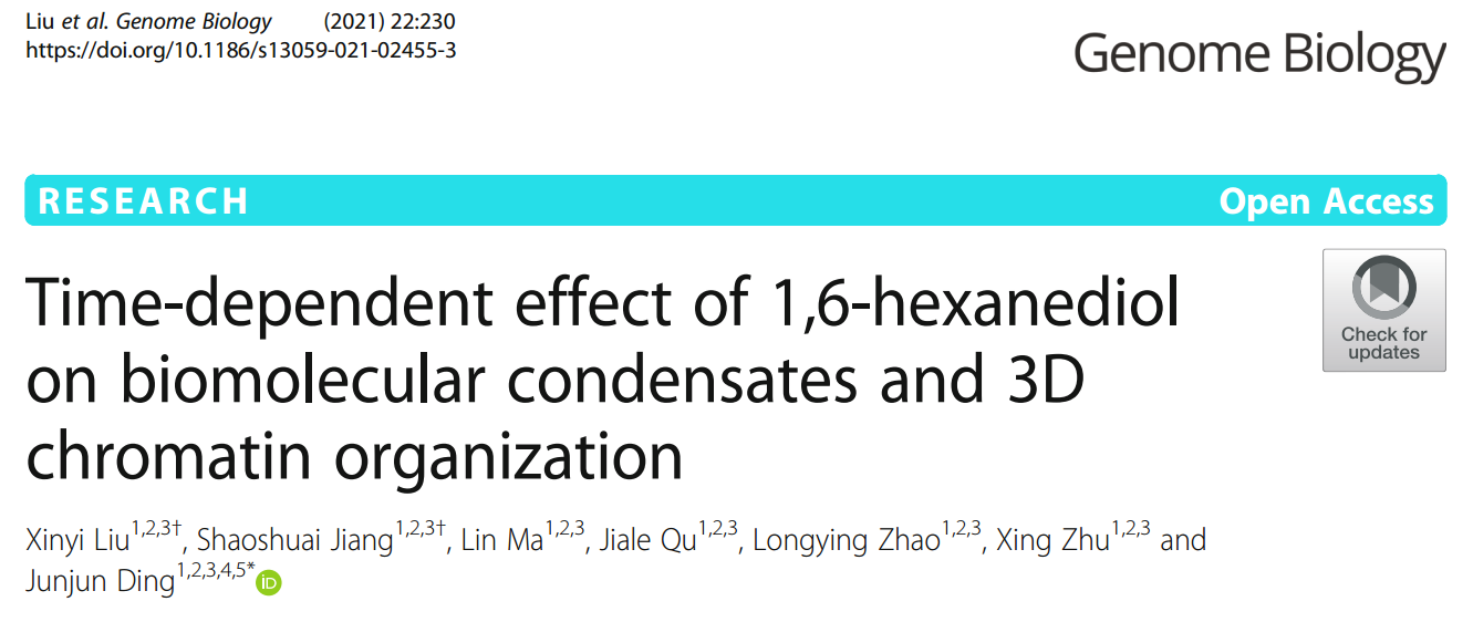 On 17 August 2021, the study of Professor Ding Junjun’s team entitled “Time-dependent effect of 1,6-hexanediol on biomolecular condensates and 3D chromatin organization” is published in Genome Biology. For the first time, the using condition of 1,6-HD (1.5%, 2 min) with fewer side effects was optimized and tested on a variety of cell lines, and a time-resolved map of 3D chromatin structure upon1,6-HD treatment was provided to explore the relationship between phase separation and 3D chromatin organization.