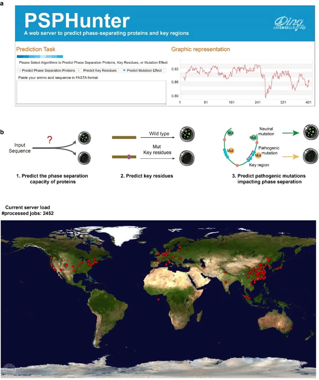 此外,研究人员开发了一个用户友好的网站(http://psphunter.stemcellding.org/) 实现PSPHunter功能,提供了三个模块,仅需输入蛋白质序列,即可实现识别关键氨基酸、预测蛋白质相分离能力以及评估突变对相分离的影响。目前基于该算法开发的网站已成功上线,并已处理计算任务2400+,为相分离领域的研究提供了重要的工具和支持。