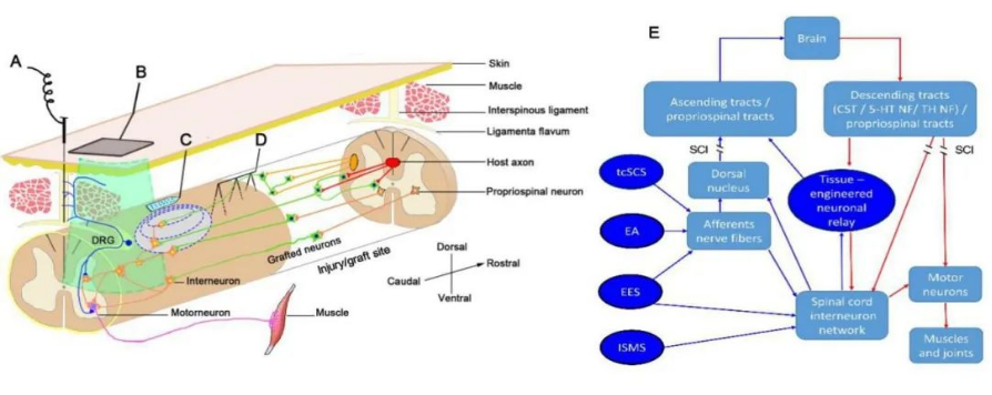 图示:干细胞源性神经元中继器联合功能性电刺激重构上下行神经环路修复脊髓损伤。A.电针刺激(EA);B. 经皮脊髓电刺激(tcSCS);C. 硬膜外电刺激(EES);D. 脊髓内微电极刺激(ISMS);E. 组织工程神经元中继器联合功能性电刺激重构上下行神经环路修复脊髓损伤的神经通路解析。